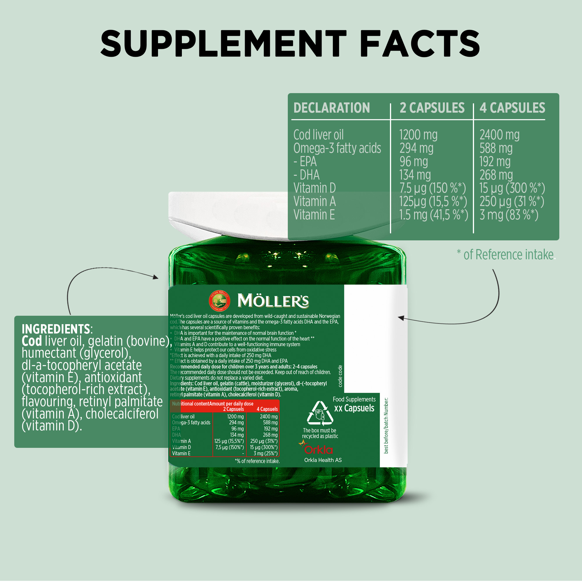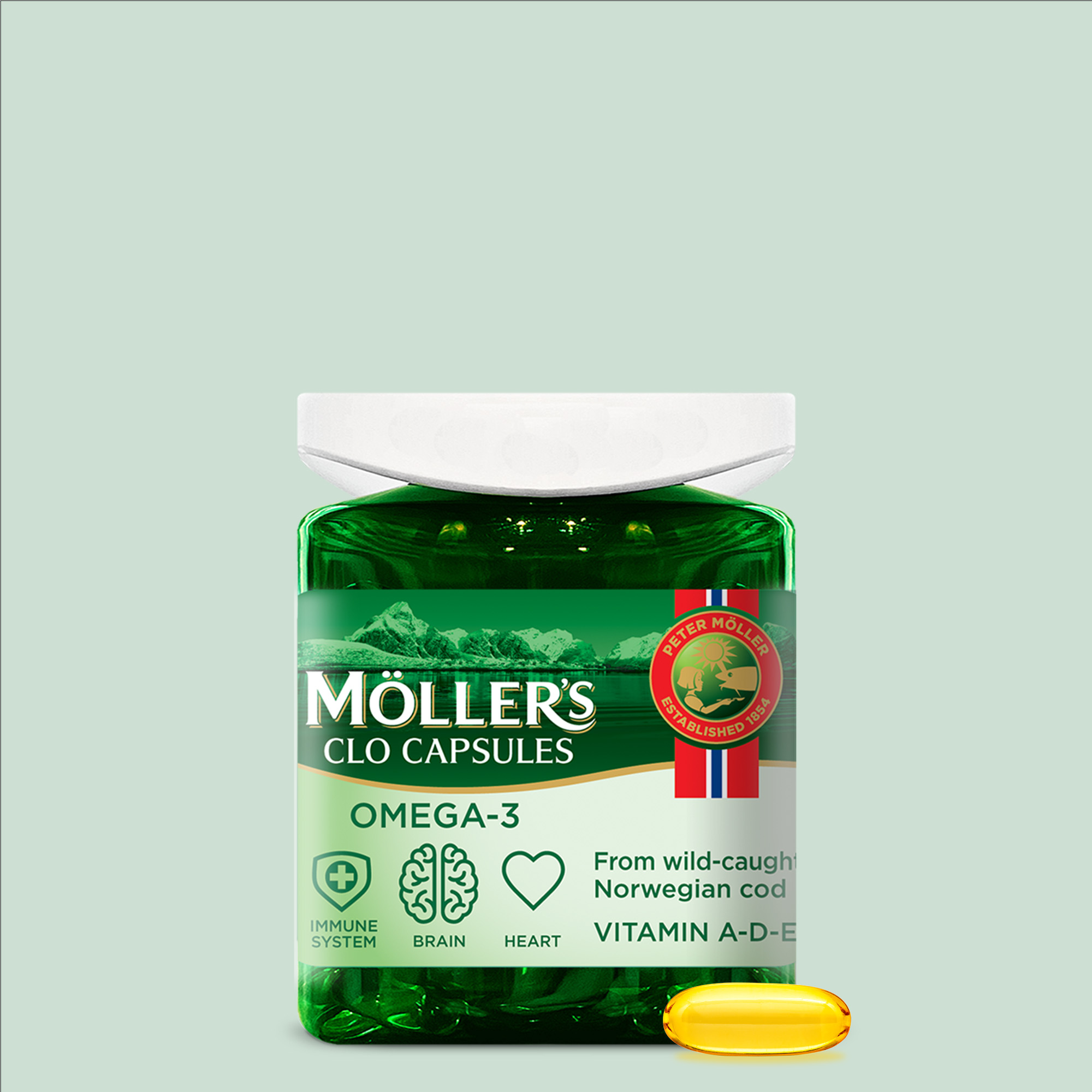 Möller’s Cod Liver Oil capsules from wild-caught Norwegian cod liver oil with vitamins A and D. Cod liver oil has been a part of Norwegian culture for centuries. Cod liver oil capsules is a convenient way to supplement your die. Capsules are smooth, easy to swallow and do have no cod liver oil taste.