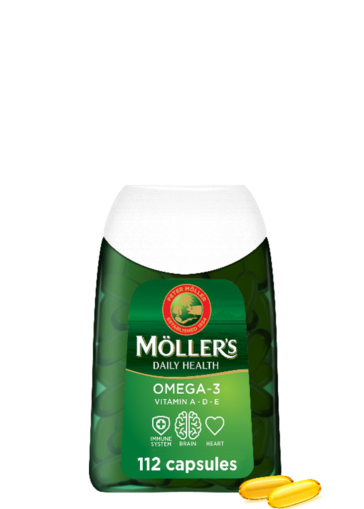 Möller’s Daily Health is a unique combination of concentrated omega-3 fish oil and vitamins D, A and E. A high amount of omega-3 and vitamin E in fewer capsules.